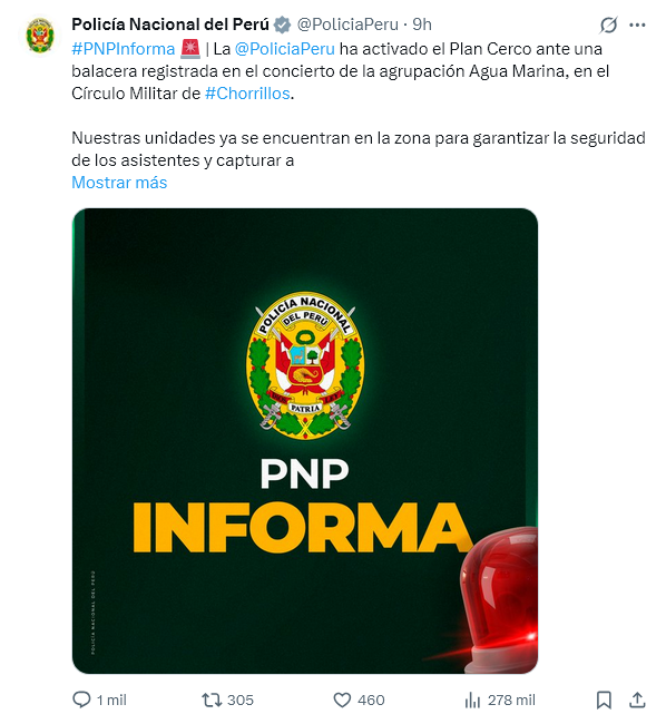 Durante la presentación del grupo de cumbia, se desató una balacera que generó pánico entre los asistentes y dejó cinco personas heridas. Por lo que efectivos de la PNP cercaron la zona y auxiliaron a las víctimas.