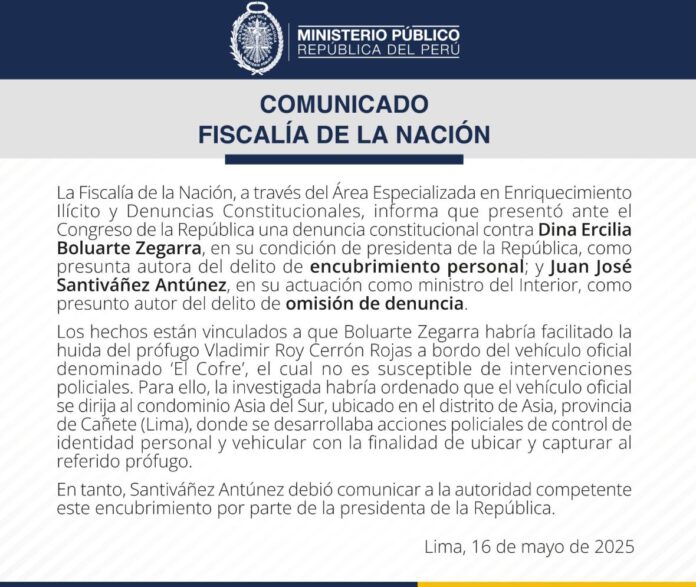 “Boluarte Zegarra habría facilitado la huida del prófugo Vladimir Roy Cerrón Rojas a bordo del vehículo oficial denominado ‘El Cofre’. (…) En tanto, Santiváñez Antúnez debió comunicar a la autoridad competente este encubrimiento por parte de la presidenta de la República”, indica la tesis fiscal.