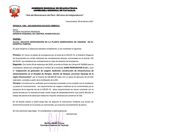 Pero el retraso de la puesta en funcionamiento de la planta que el gobierno regional ha contrato en el mes de setiembre debió haberse entregado en veinte días, y a la fecha no funciona, por ello ha solicitado a la Contraloría General con fecha 8 de febrero la consejera Maritza Ravelo que intervenga en esta obra, ya que habría un claro incumplimiento de los plazos por parte de la empresa Alma Repuestos E.I.R.L. y se pueda evitar mayores consecuencias por la falta de oxígeno, ya que los casos de COVID-19 siguen en aumento en la provincia de Tayacaja.