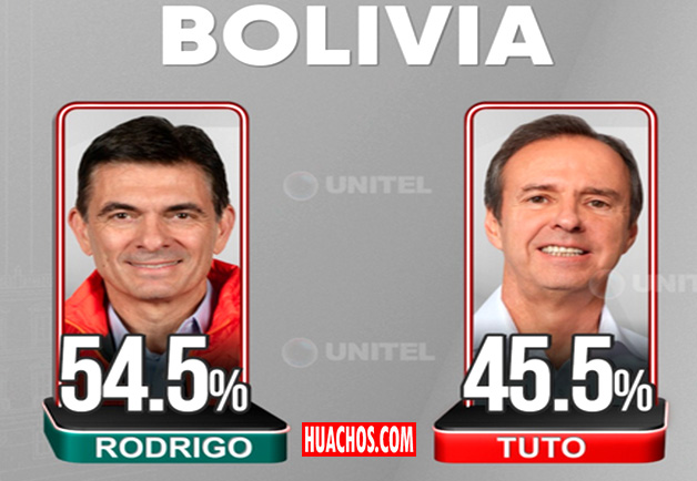 Paz obtuvo ese porcentaje frente a un 45,43 % del exmandatario conservador Jorge Tuto Quiroga (2001-2002), según los datos del Sistema de Transmisión de Resultados Preliminares (Sirepre) ofrecidos esta noche por el TSE, con el 97,68 % de las actas computadas.