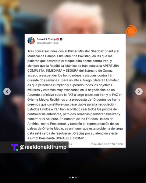 El presidente, Donald Trump, informó este martes a través de la red social Truth Social de que tras conversaciones con el primer ministro pakistaní, que "sujeto a que la República Islámica de Irán acceda a la APERTURA COMPLETA, INMEDIATA y SEGURA del Estrecho de Ormuz, accedo a suspender el bombardeo y el ataque contra Irán por un período de dos semanas. ¡Este será un ALTO EL FUEGO bilateral!"