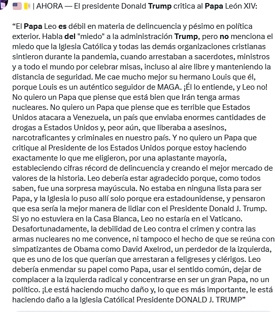 Poco después, Trump habló con los periodistas en la Base Conjunta Andrews, donde había aterrizado procedente de Florida a bordo del Air Force One. “No creo que esté haciendo un muy buen trabajo”, declaró el republicano; “no soy admirador del papa León”.