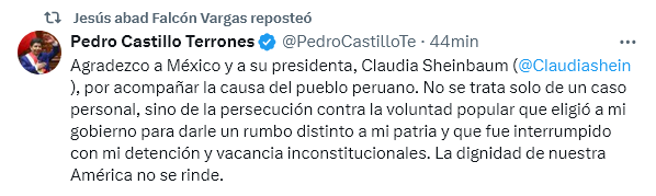 El ciudadano Pedro Castillo no es un perseguido político, como falsamente pretende sostener la señora Sheinbaum. El 7 de diciembre de 2022, el ciudadano Castillo cometió el flagrante quiebre del orden constitucional al anunciar la disolución inconstitucional del Congreso de la República y la instauración de un Gobierno de excepción, así como la reorganización del Poder Judicial, la Fiscalía de la Nación, la Junta Nacional de Justicia y el Tribunal Constitucional.