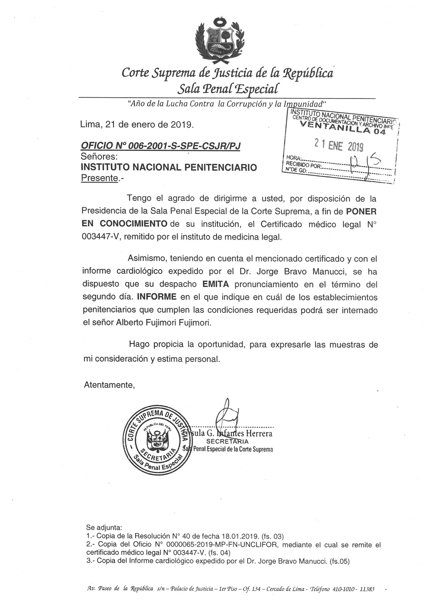 #Atención | Tal como lo anunció el sábado, la Sala Penal Especial de la Corte Suprema envió esta mañana al Instituto Nacional Penitenciario (Inpe), el oficio relacionado al caso de Alberto Fujimori. pic.twitter.com/zkzZgmZoSU
