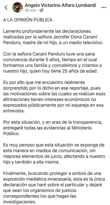 Tras la difusión de la denuncia, Ángelo Alfaro emitió un pronunciamiento a través de su cuenta de Facebook.